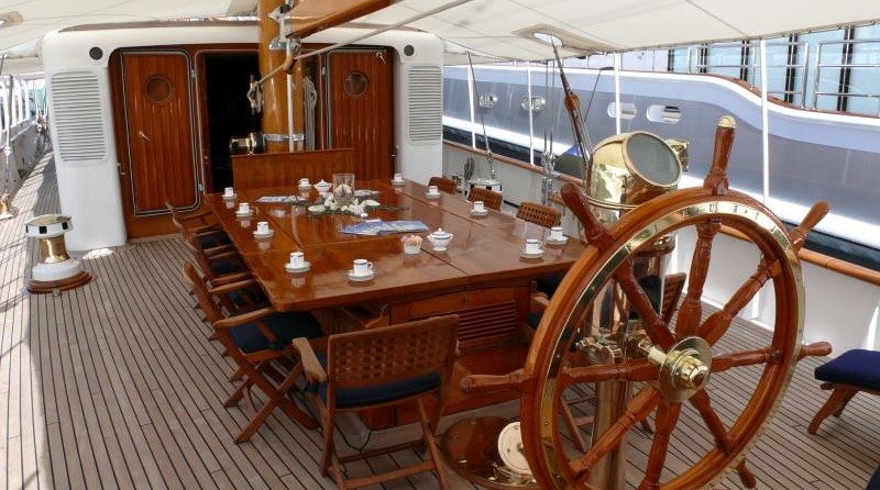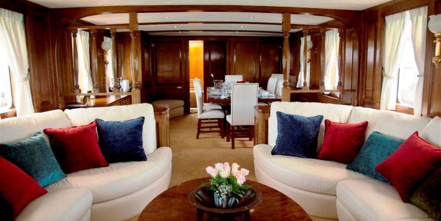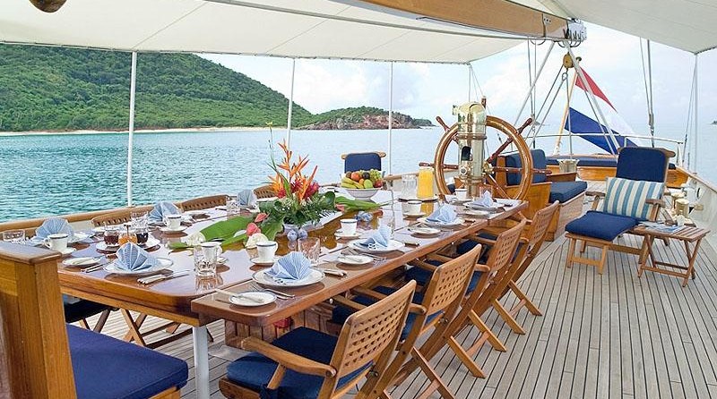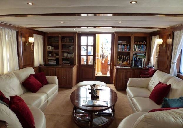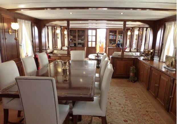 The sailing yacht can accommodate 12 guests in 8 cabins with an interior design by Leila Kennedy and an exterior design by Robert Clark.