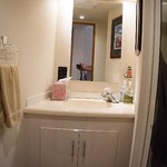 - Mirrored upper vanity with storage
