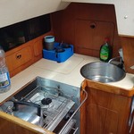 7 berths, 2 cabins, wood cabin sole, chart table, saloon table, wet locker, sea toilet, wash basin, grill/oven, cooker, gallery sink, refrigerating cool box, crockery, cuttlery, 2 gas cylinders.