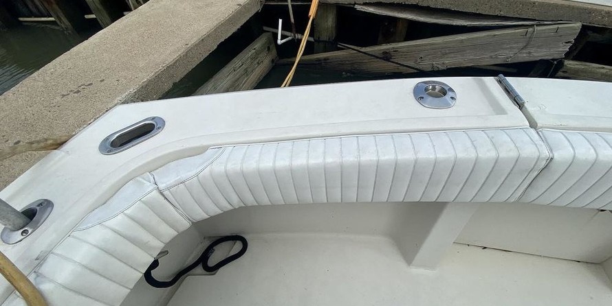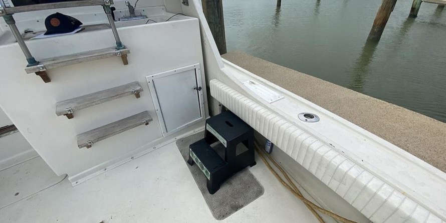 The aft deck is a fisherman's delight: the cockpit deck measures 12'7" x 10'1", includes a fighting chair (not pictured) and a large transom door for bringing your big catch onboard.