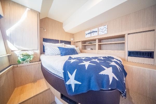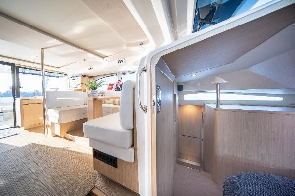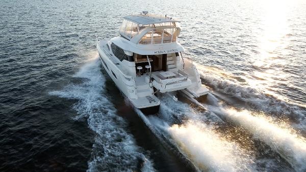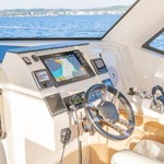 On the Aquila 44 you will enjoy the 360˚ view from the spacious salon and galley that features a large seating area, hidden TV stowage and plenty of storage to make a live-aboard or cruising easy and pleasant. Galley features include Corian countertops, electric fridge and freezer, stove, and stainless steel microwave oven as well as a double stainless steel sink. The large staterooms each feature ample headroom and large windows for excellent views. A fresh water flush, separate shower stall and teak flooring compliment the boat’s design and exceptional living comforts. Additional features include an oversized flybridge with added enclosure, electric grill, and sunpad seating on either side of the central helm station and Aquila's revolutionary bridge to bow direct access.