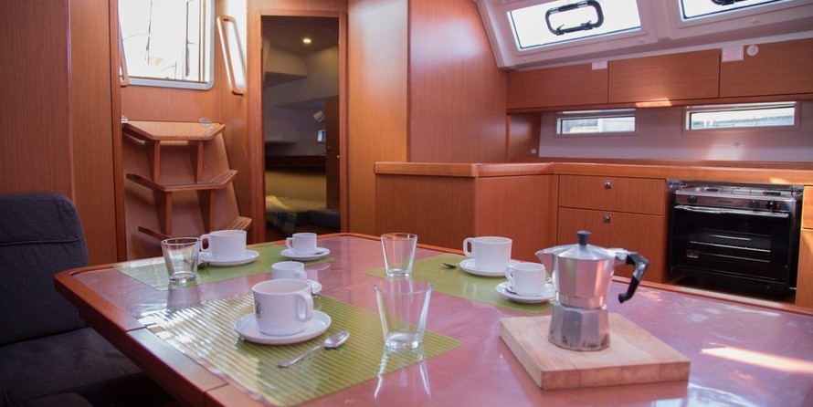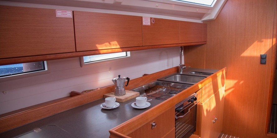 Boat equipment features classical mainsail, bimini and bow thruster. It also boasts an an audio system, outside speakers and inside speakers. The fully-equipped galley includes a freezer, oven, cooker, sink and kitchen utensils.
