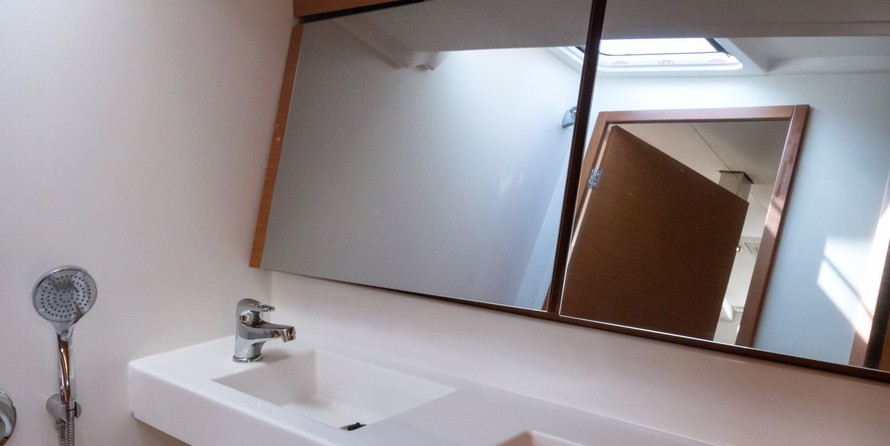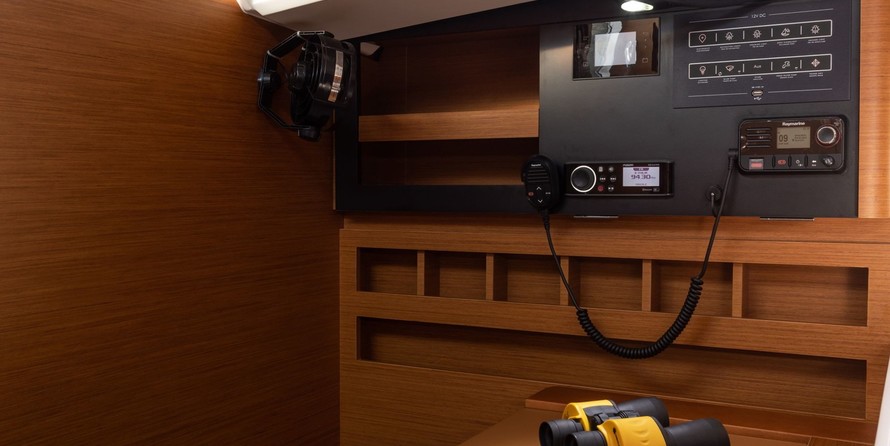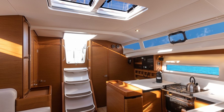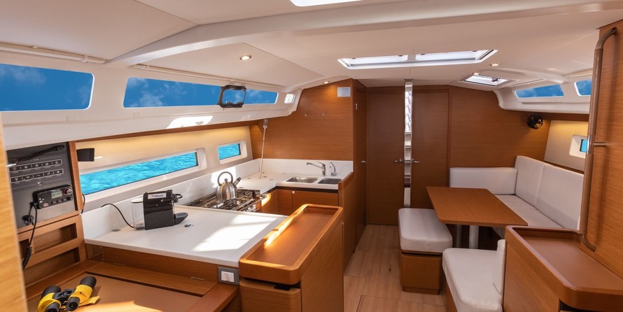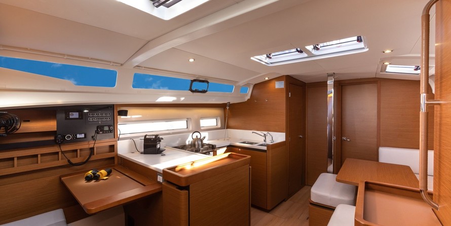 Boat equipment features rolling mainsail, electric winches, bimini and bow thruster. It also boasts a heating, air conditioning, an audio system, outside speakers and inside speakers. The fully-equipped galley includes a microwave, coffee machine, oven, cooker and sink.