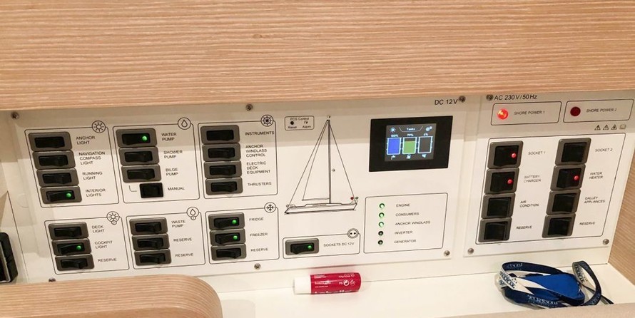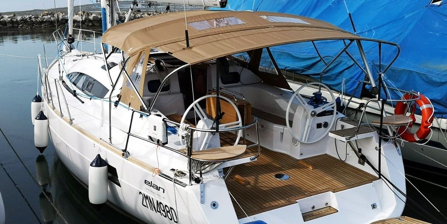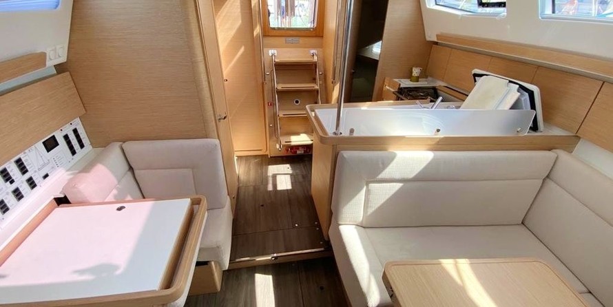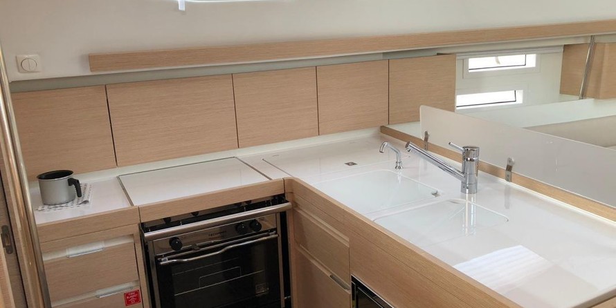 Boat equipment features classical mainsail, bimini and bow thruster. It also boasts a heating, an audio system, outside speakers and inside speakers. The fully-equipped galley includes a freezer, oven, cooker, sink and kitchen utensils.