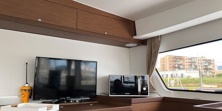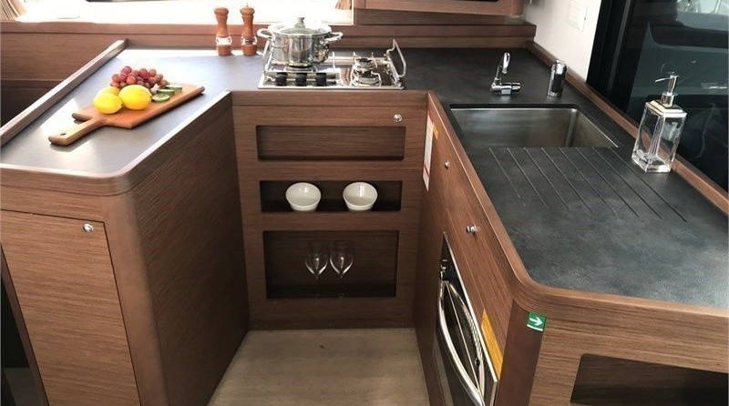 Boat equipment features classical mainsail, electric winches, solar panels, radar, bimini and outside gps plotter. It also boasts a flat screen tv, heating, an audio system, outside speakers and inside speakers. The fully-equipped galley includes a microwave, coffee machine, oven, cooker and sink.