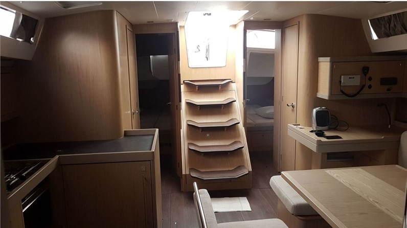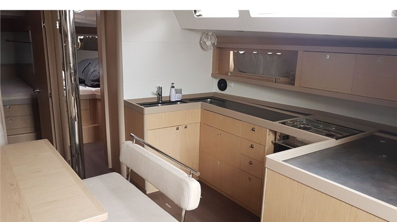 Boat equipment features rolling mainsail, salon gps plotter, bimini and bow thruster. It also boasts an an audio system, outside speakers and inside speakers. The fully-equipped galley includes an oven, cooker, sink and kitchen utensils.