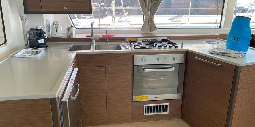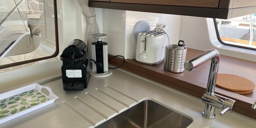 Boat equipment features classical mainsail, electric winches, generator, bimini and outside gps plotter. It also boasts a heating, air conditioning, an audio system, outside speakers and flybridge. The fully-equipped galley includes an ice maker, coffee machine, oven, cooker and sink.