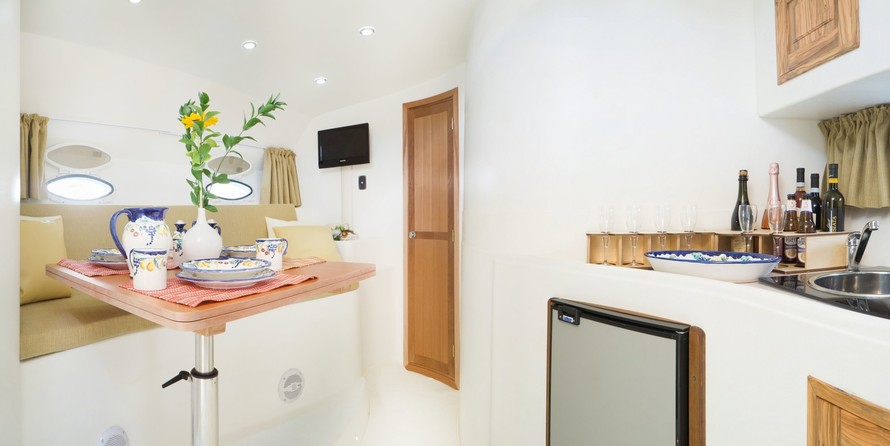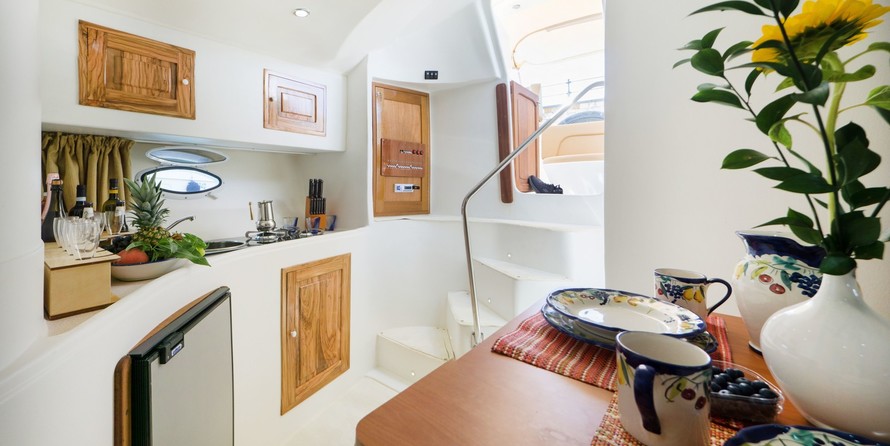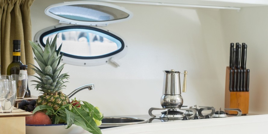 Boat equipment features bimini and outside gps plotter. It also boasts a flat screen tv, an audio system and outside speakers. The fully-equipped galley includes a freezer, coffee machine, cooker and sink.