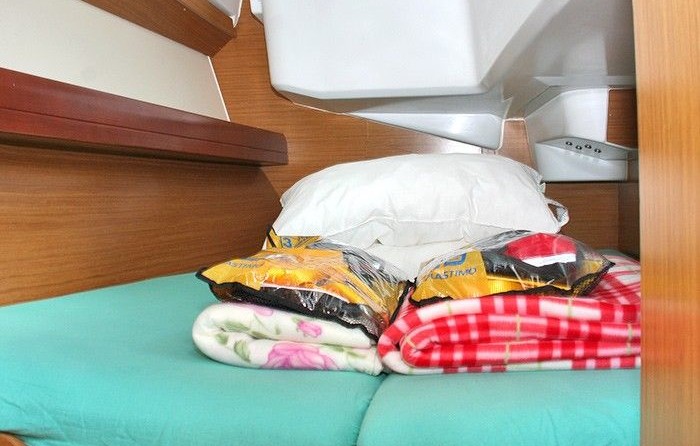 La Vigne Verte can accommodate up to 8 people in 3 double cabins and a saloon with 2 extra beds. Pillows and blankets are included in the price.