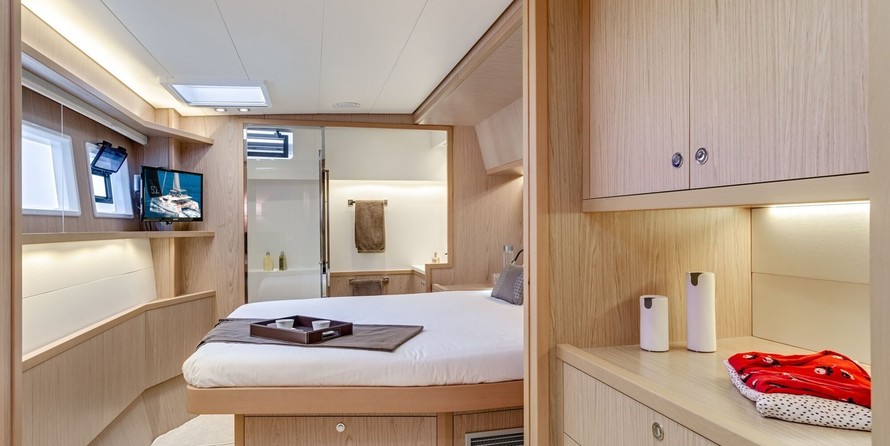 5-cabin catamaran Lagoon 52 F - Fichissimo was built in 2022, and it is docked in Capo d’Orlando marina, Italy.