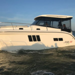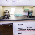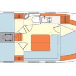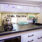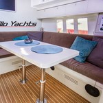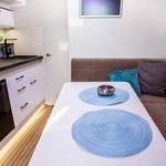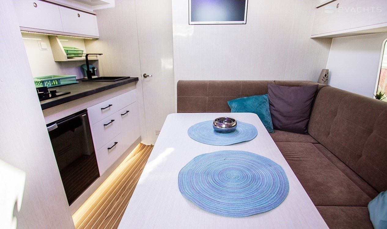 Boat equipment features bimini and bow thruster. It also boasts a flat screen tv, heating, an audio system and inside speakers. The fully-equipped galley includes a cooker, sink and kitchen utensils.