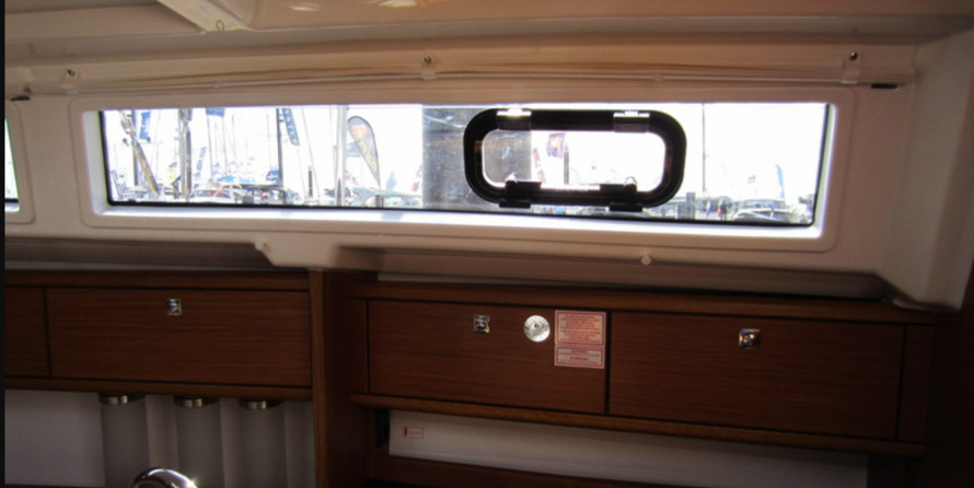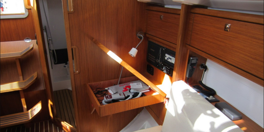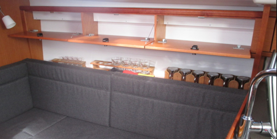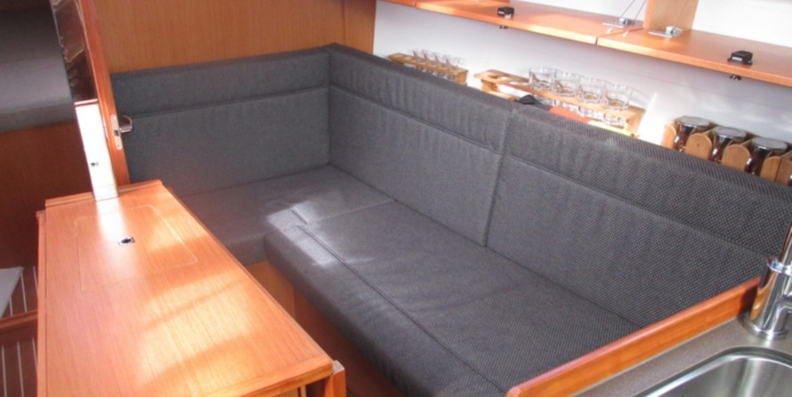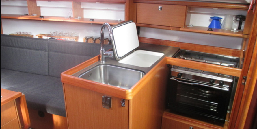 Boat equipment features classical mainsail, electric winches, bimini and outside gps plotter. It also boasts a heating, washing machine, an audio system, outside speakers and inside speakers. The fully-equipped galley includes an oven, cooker, sink and kitchen utensils.