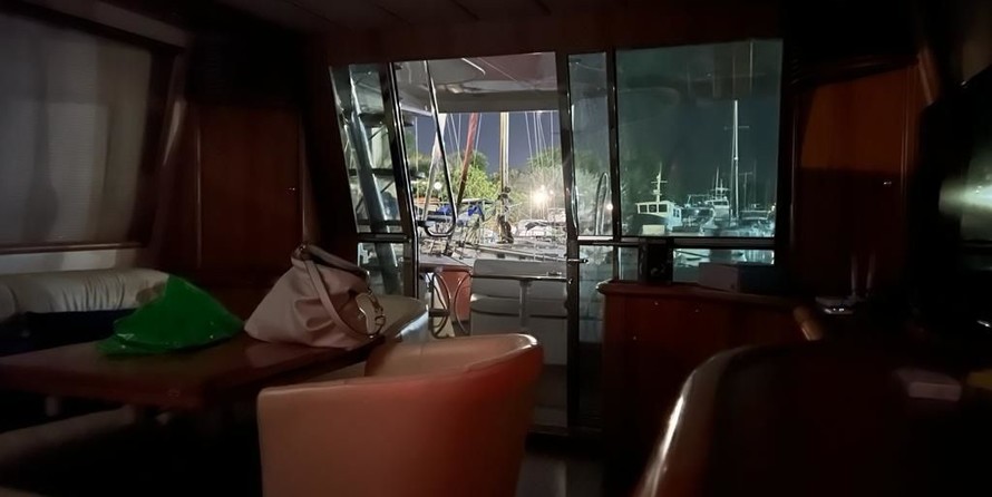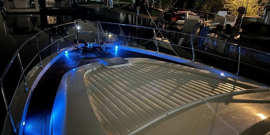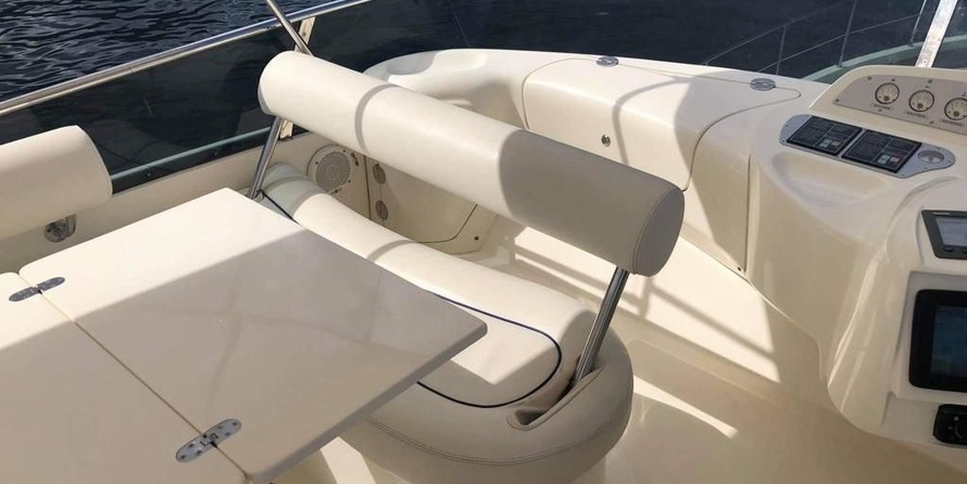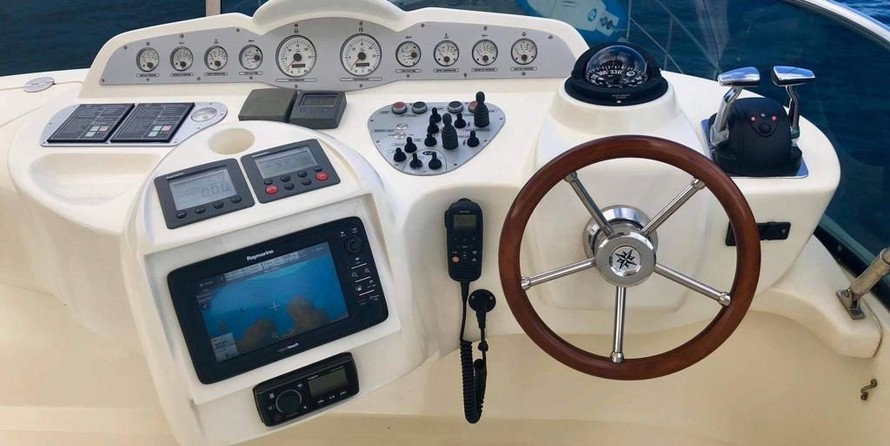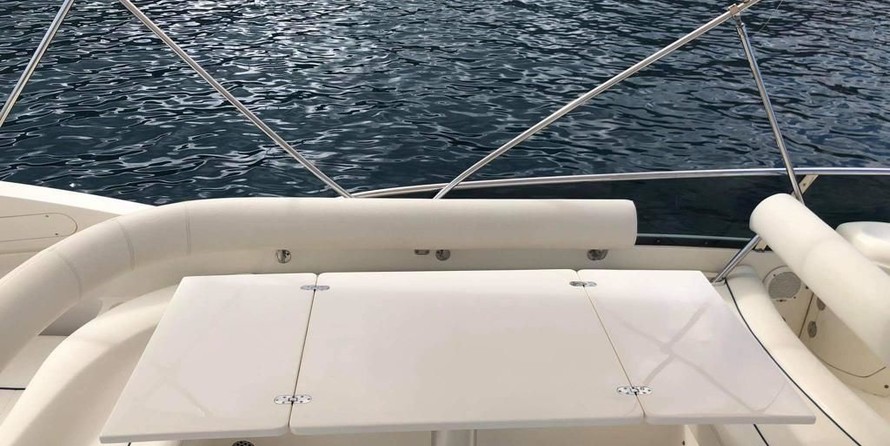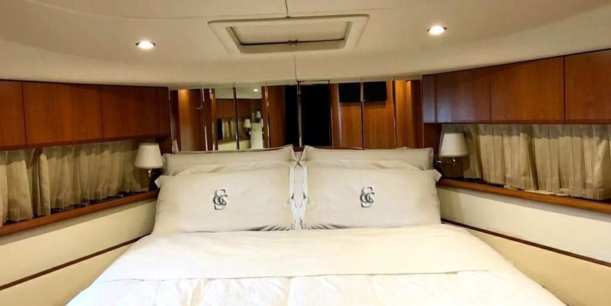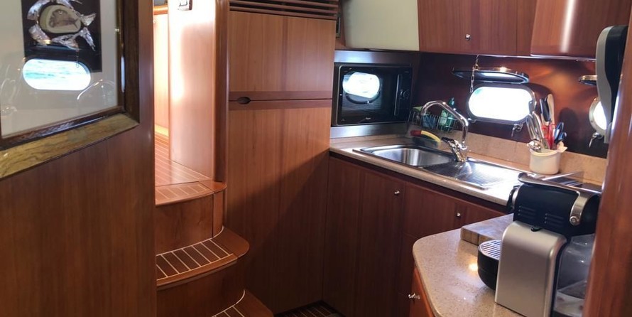 Boat equipment features radar, generator, bimini and bow thruster. It also boasts an air conditioning, an audio system, outside speakers and inside speakers. The fully-equipped galley includes a microwave, ice maker, oven, cooker and sink.