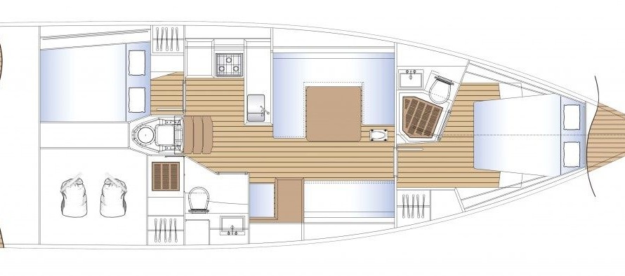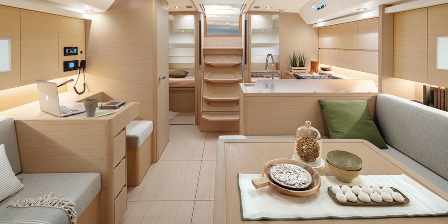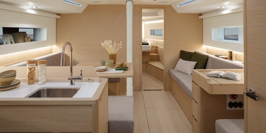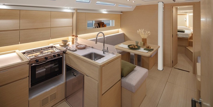 Boat equipment features classical mainsail, electric winches, solar panels and bow thruster. It also boasts a heating. The fully-equipped galley includes an oven, cooker, sink and kitchen utensils.