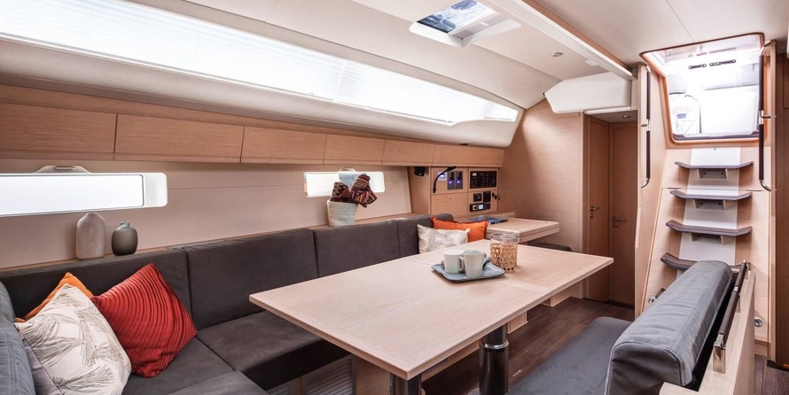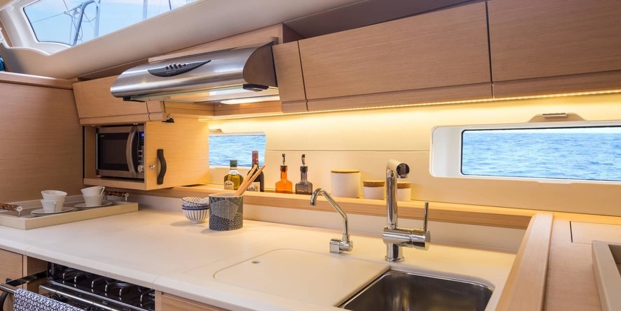 Boat equipment features rolling mainsail, electric winches, generator, bimini and bow thruster. It also boasts a heating, air conditioning, an audio system, outside speakers and inside speakers. The fully-equipped galley includes a microwave, freezer, coffee machine, oven and cooker.
