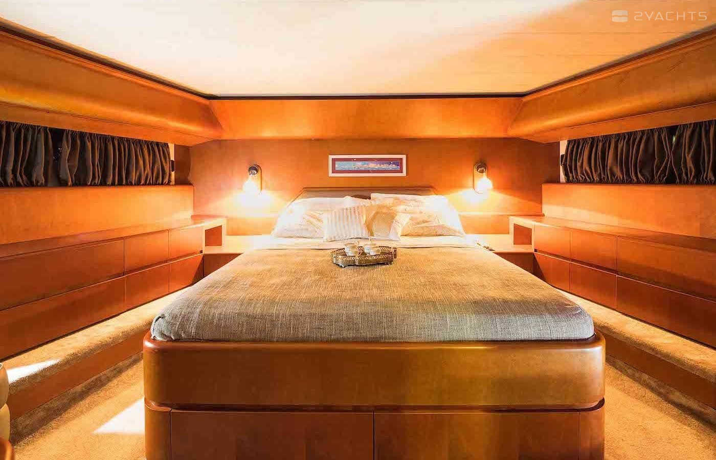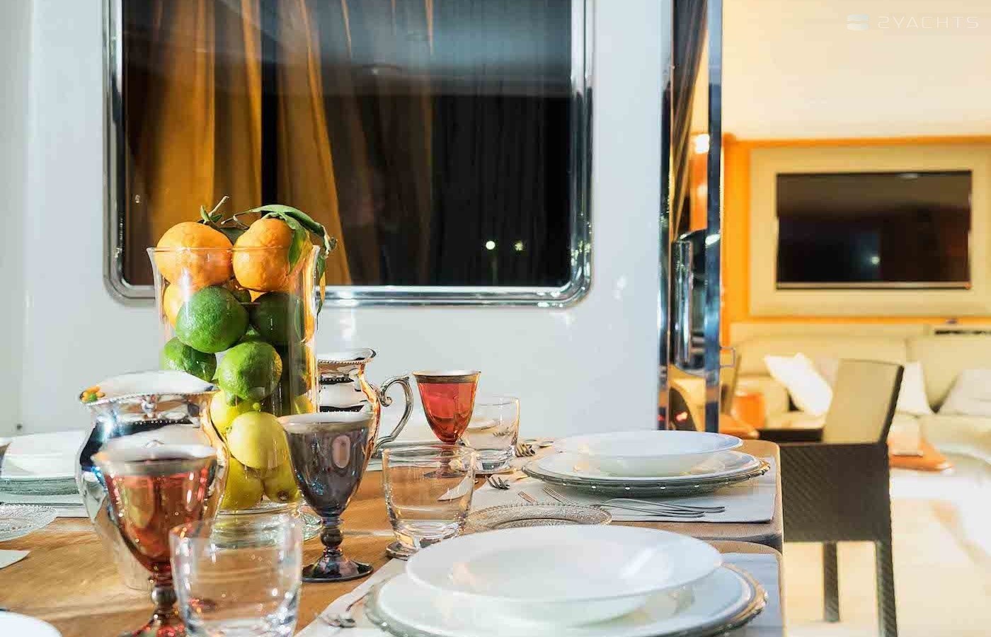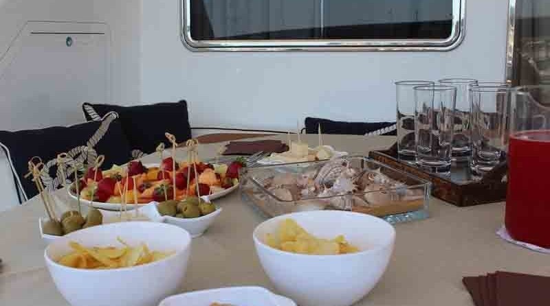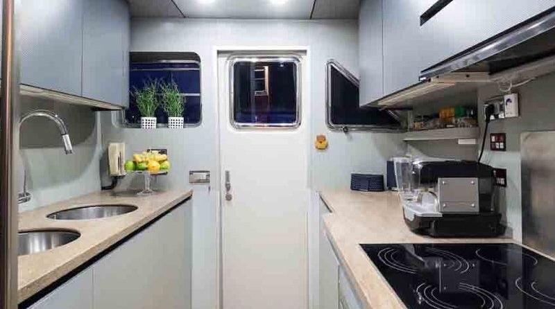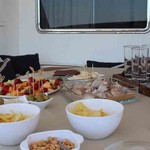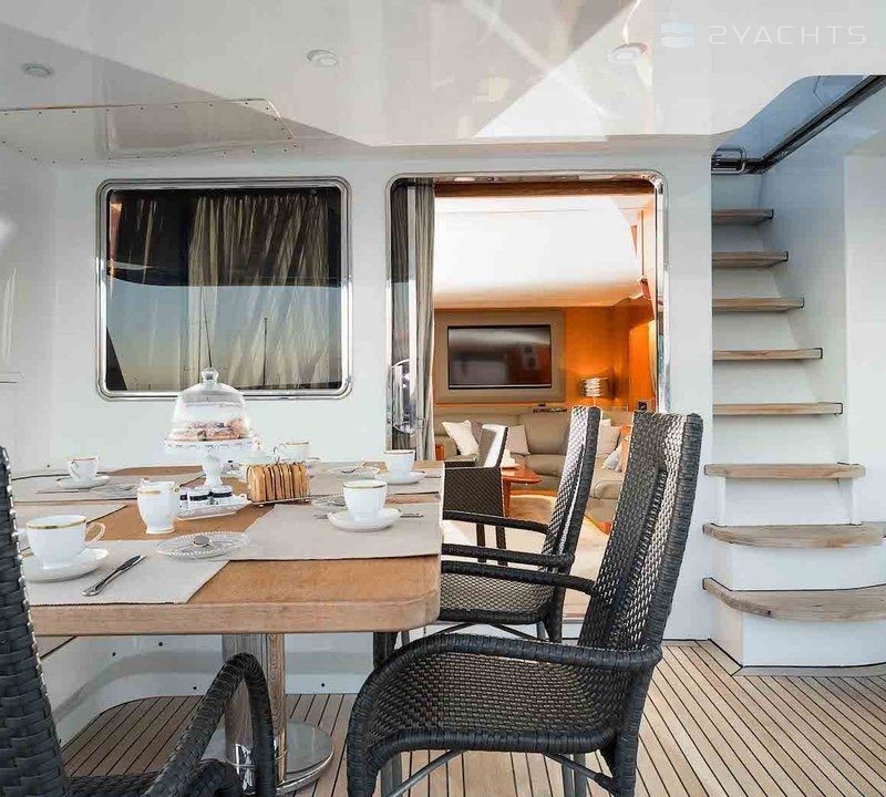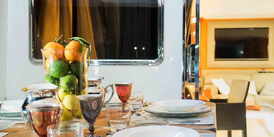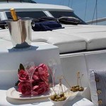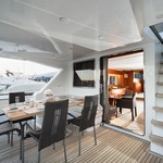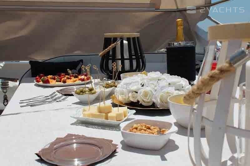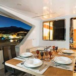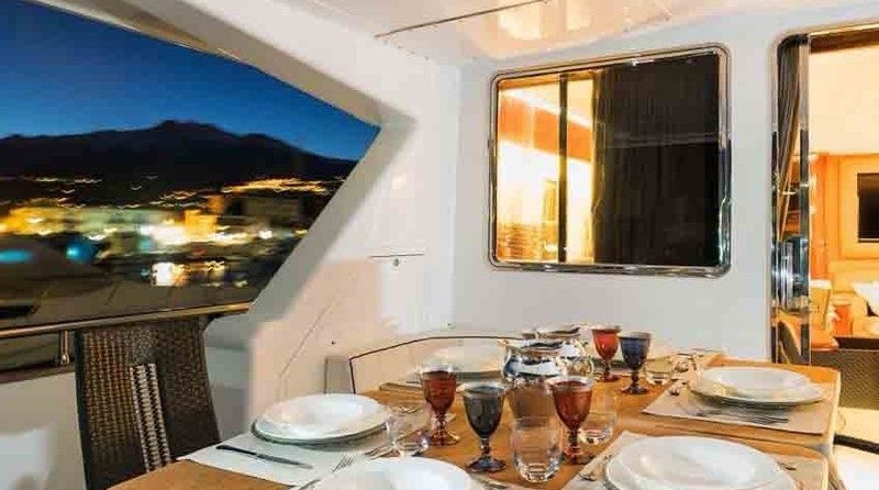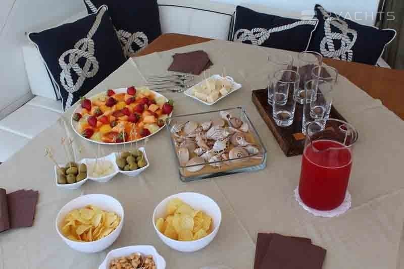 Boat equipment features generator, salon gps plotter, bbq, bimini and bow thruster. It also boasts a flat screen tv, air conditioning, washing machine, an audio system and outside speakers. The fully-equipped galley includes a microwave, dishwasher, freezer, coffee machine and oven.