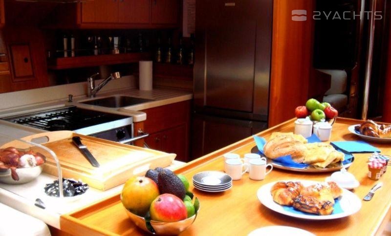 Sie wird angetrieben von Mercedes-Motoren von 260 hp jeder gibt Ihr eine maximale Geschwindigkeit von 11 Knoten und einer Reisegeschwindigkeit von 10 Knoten.
