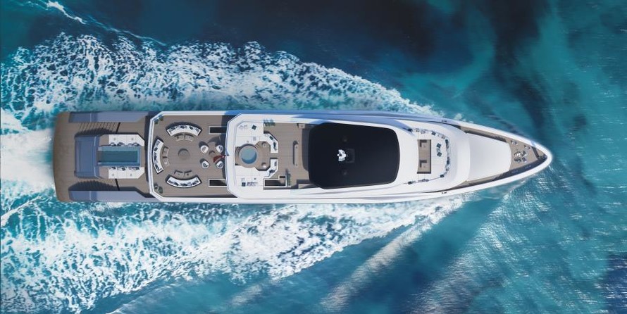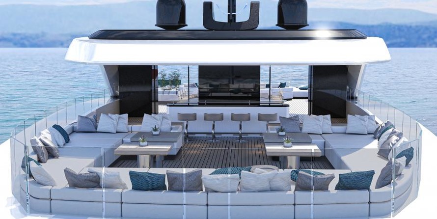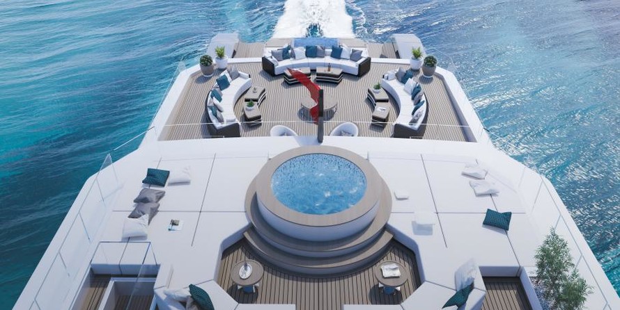 Una cubierta más arriba, en la cubierta principal, la popa, que invita a relajarse. Aquí, a unos cinco metros de largo, piscina de borde infinito adyacentes incluyendo sunpads será instalado en el CONSEJO de 65 años. Una zona de salón con dos auténtico sofás formas de la transición a las nic, que tiene una superficie de 120 metros cuadrados y una altura de 2.30 metros, como casi todas las habitaciones de la junta. Caliente Lab propone para el diseño de muebles y de un sofá paisaje, un bar, un piano y una mesa de comedor para un total de 14 personas. Ventanas de piso a techo y un corte en el baluarte va a inundar el salón con mucha luz natural y se conectan el interior con el ambiente tan intenso como sea posible.