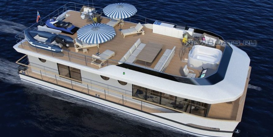 Sur le flybridge, vous pouvez mettre le deuxième poste de contrôle. Le kit comprend des chaises longues, canapés, installations pour barbecue, jacuzzi ou la piscine, parasols. Si vous le souhaitez, au lieu de parasols, vous pouvez installer le hard-top, sur lequel sont placés des panneaux solaires pour fournir de l'énergie du soleil. En hiver, le flybridge ferme de l'auvent.