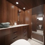 Le motor yacht peut accueillir 7 personnes dans 4 cabines avec un design d'intérieur par l'otam et un design extérieur par Umberto Tagliavini.